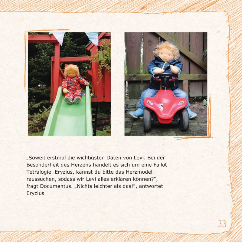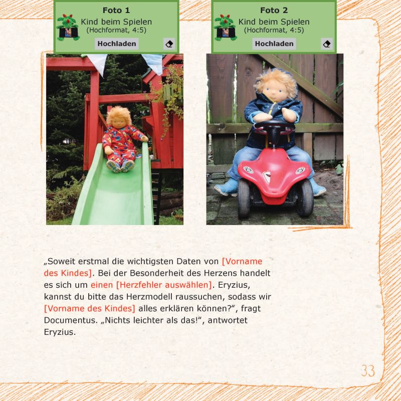 Das Skript ist bereits vollständig mit Fotos gestaltet, um die Geschichte anschaulich zu erzählen. Alle Untersuchungen, die Intensivstation und weitere medizinische Abläufe sind mit einer kleinkindgroßen Puppe nachgestellt. Käufer können eine Mischung aus eigenen Fotos des Kindes und den vorgegebenen Bildern wählen. So kann beispielsweise die Intensivstationsszene mit der Puppe belassen werden, falls das Kind sich nicht in dieser Situation sehen soll.