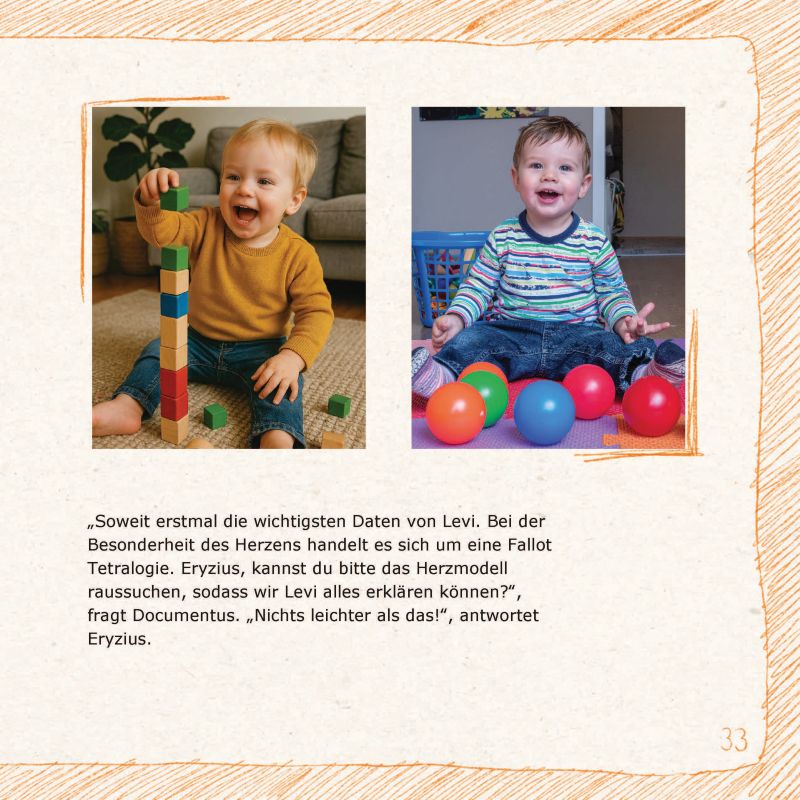 Jedes Herz ist einzigartig – und genau deshalb verdient jedes Kind seine ganz persönliche Geschichte! Mit der interaktiven Buchvorlage „Die Herzpatrouille – Im Einsatz für [Name des Herzhelden]“ erhalten Eltern, Verwandte und Freunde die Möglichkeit, ihrem kleinen Herzhelden auf liebevolle und kindgerechte Weise den Grund für z.B. seine Narbe und die Herzreparatur zu erklären.
