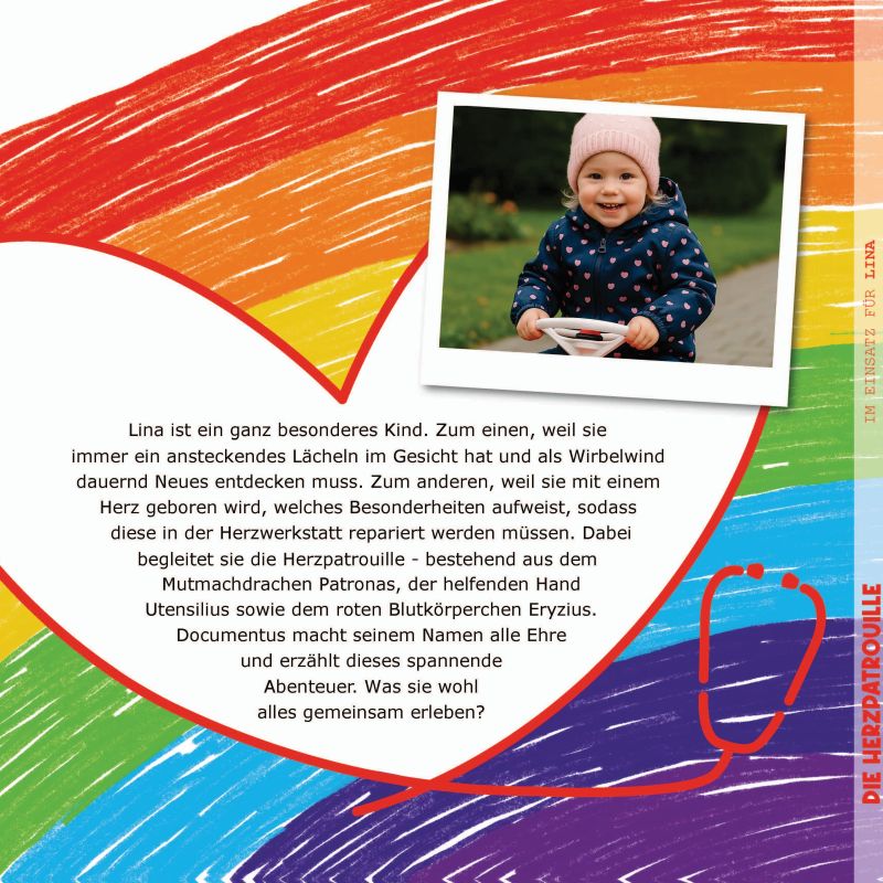 Die Herzpatrouille ist ein Team mutiger Helfer, die immer dann zur Stelle sind, wenn ein kleines Herz Unterstützung braucht. In diesem Buch wird das Kind selbst zur Hauptfigur – Name, persönliche Daten, individuelle Fotos und der jeweilige Herzfehler werden integriert und machen die Geschichte zu einem ganz besonderen Erlebnis.