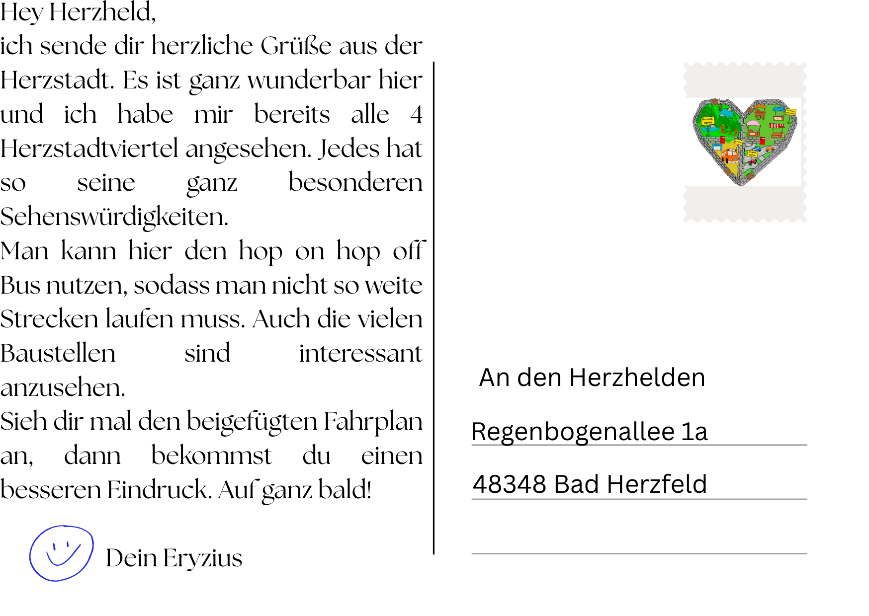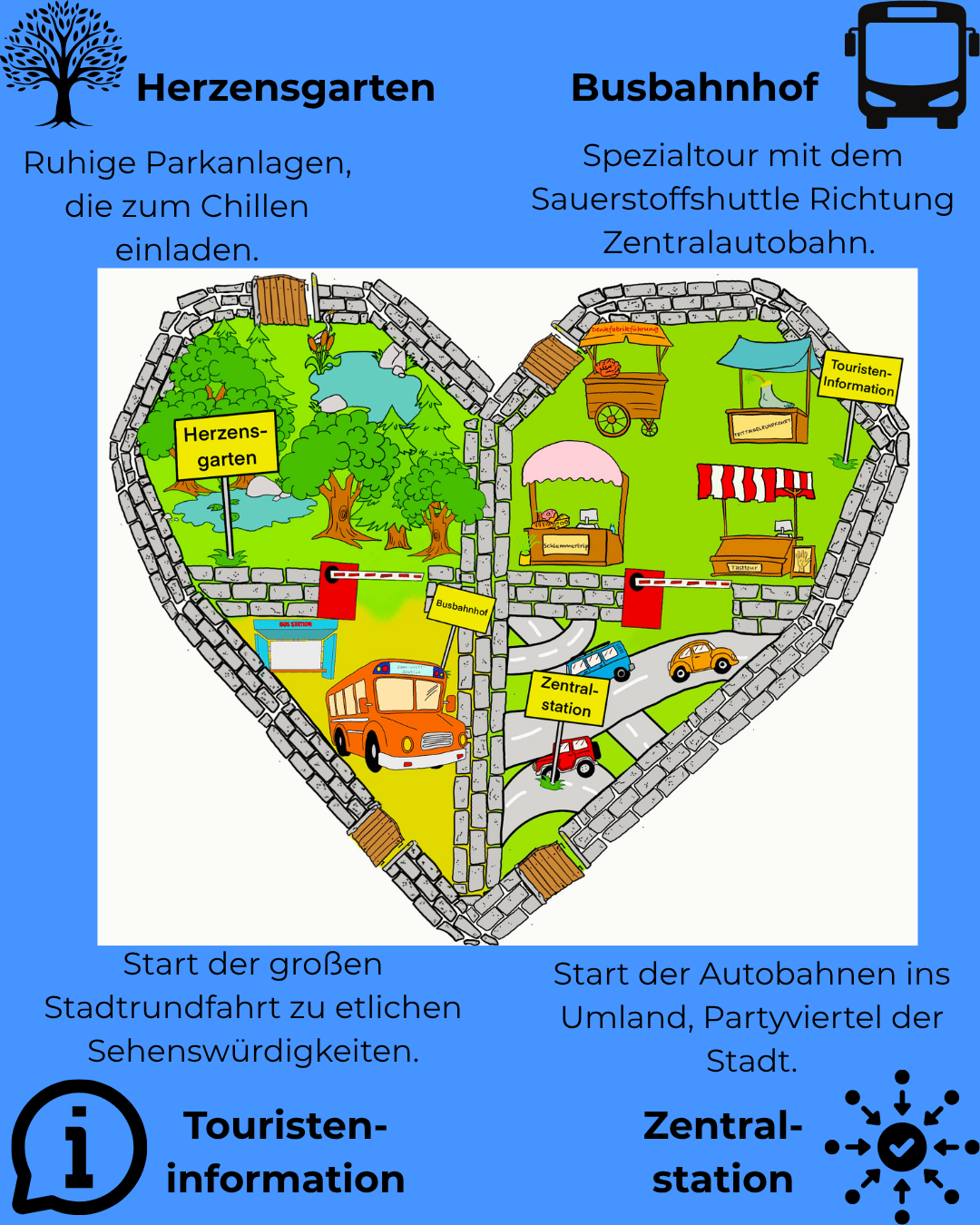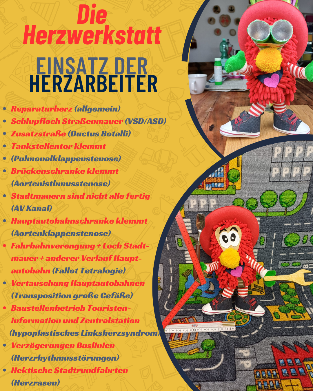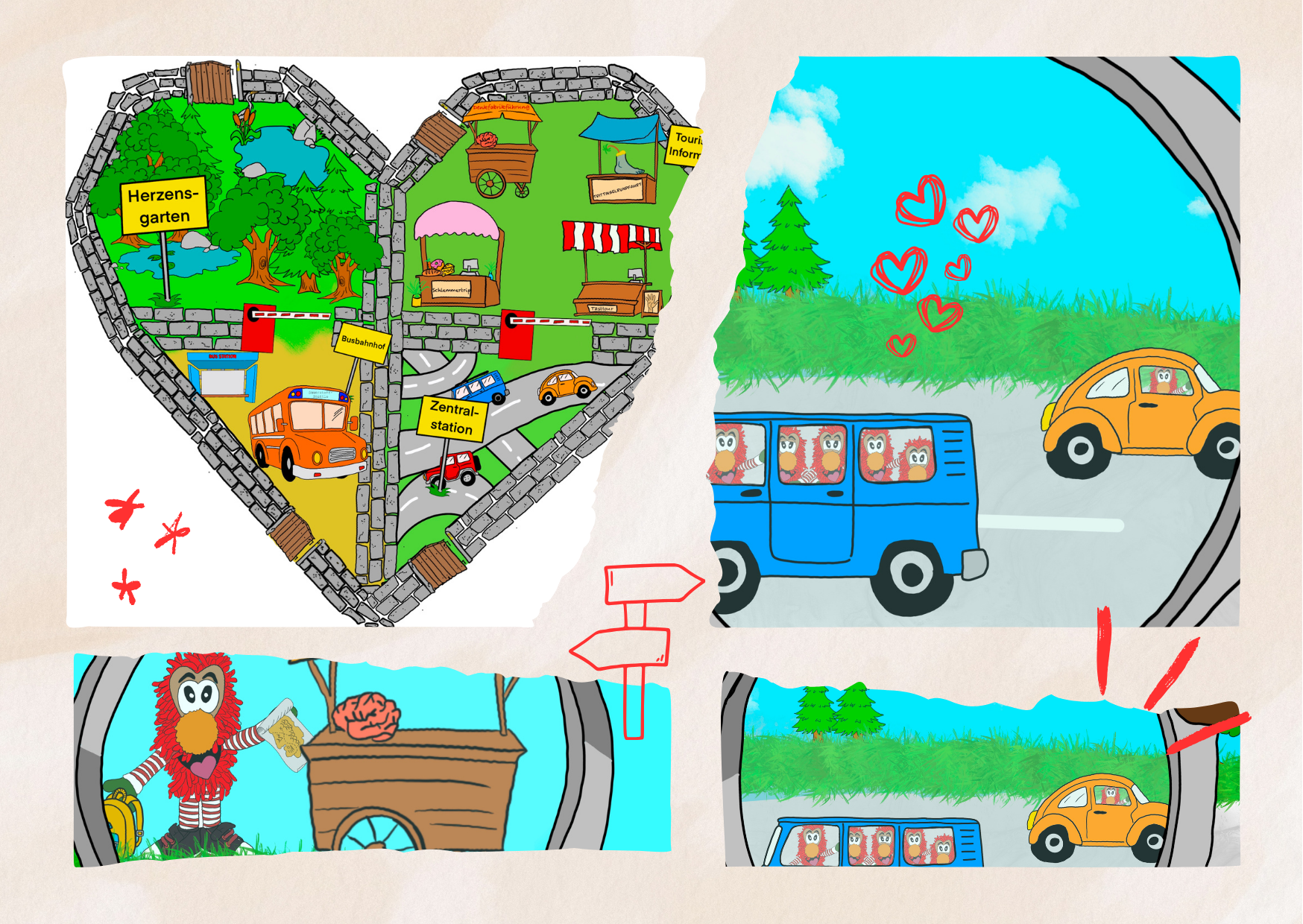 Die Herzstadt bietet eine kindgerechte und anschauliche Form, Kindern den Aufbau und die Funktionsweise ihres Herzens näherzubringen. Statt komplizierter Fachbegriffe entdecken sie vier bunte Stadtviertel, die die Herzkammern darstellen. Mit dem Stadtführer Eryzius geht es auf spannende Rundfahrten durch den kleinen und großen Kreislauf – und so wird verständlich, was im Herzen Tag für Tag passiert. Auch angeborene Herzfehler werden kindgerecht erklärt – als Baustellen in der Stadt, wie eine klemmende Schranke oder ein Loch in der Stadtmauer. Mit Hilfe der fleißigen Herzarbeiter wird nachvollziehbar, wie diese Baustellen behoben werden können. So eröffnet die Herzstadt einen liebevollen Zugang zu einem komplexen Thema und unterstützt Erwachsene dabei, Kindern ihr Herz besser zu erklären.
